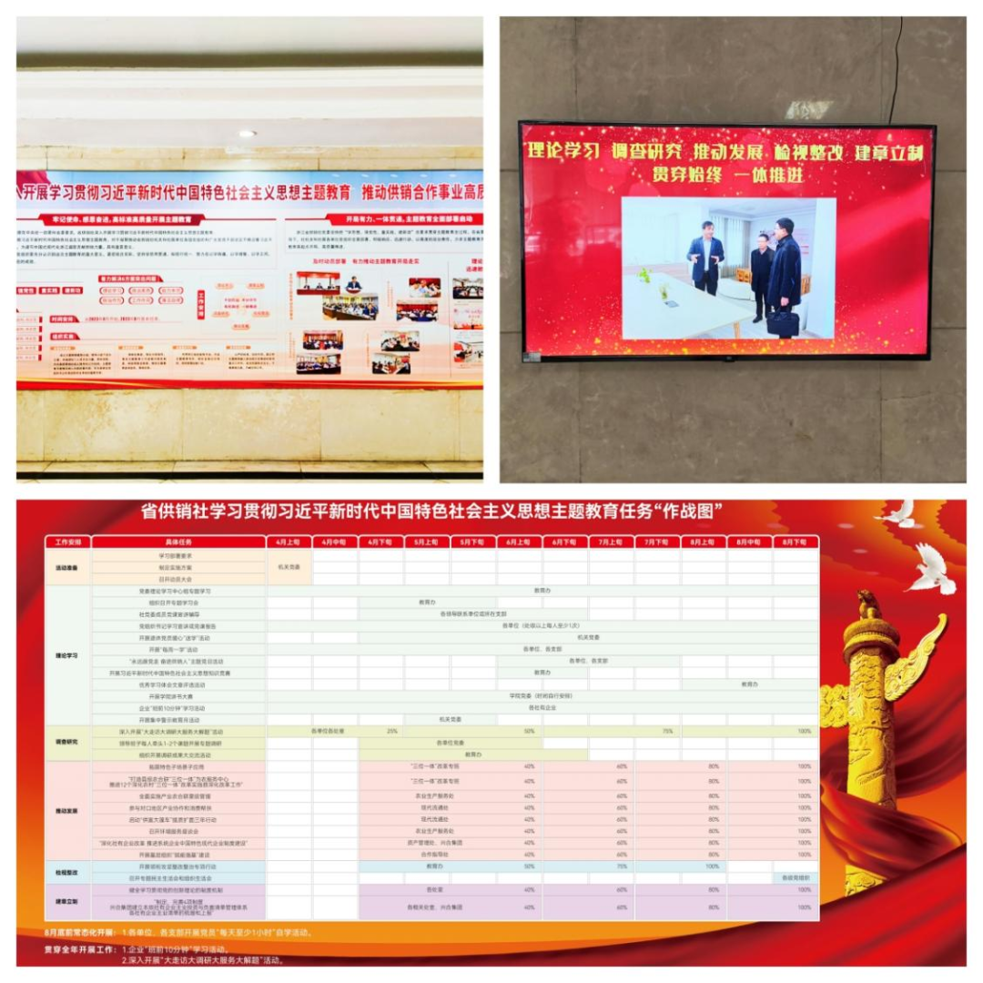 省供销社“挂图作战”,清单化明确工作任务与责任单位,并将习近平新时代中国特色社会主义思想核心内容布置于会议室,时刻学习领悟、时常感悟领会、持续深学内化;制作公共区域宣传板,持续更新呈现省供销社机关各处室、社属各单位的学习推进情况与特色亮点工作,播放主题教育学习视频,烘托浓厚学习气氛。