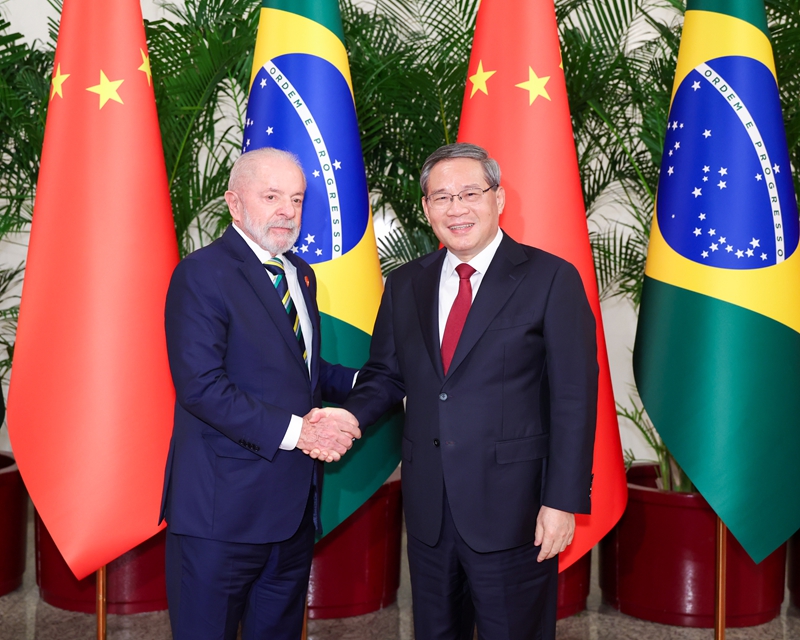 5月13日下午,国务院总理李强在北京人民大会堂会见来华进行国事访问的巴西总统卢拉。新华社记者 刘彬 摄